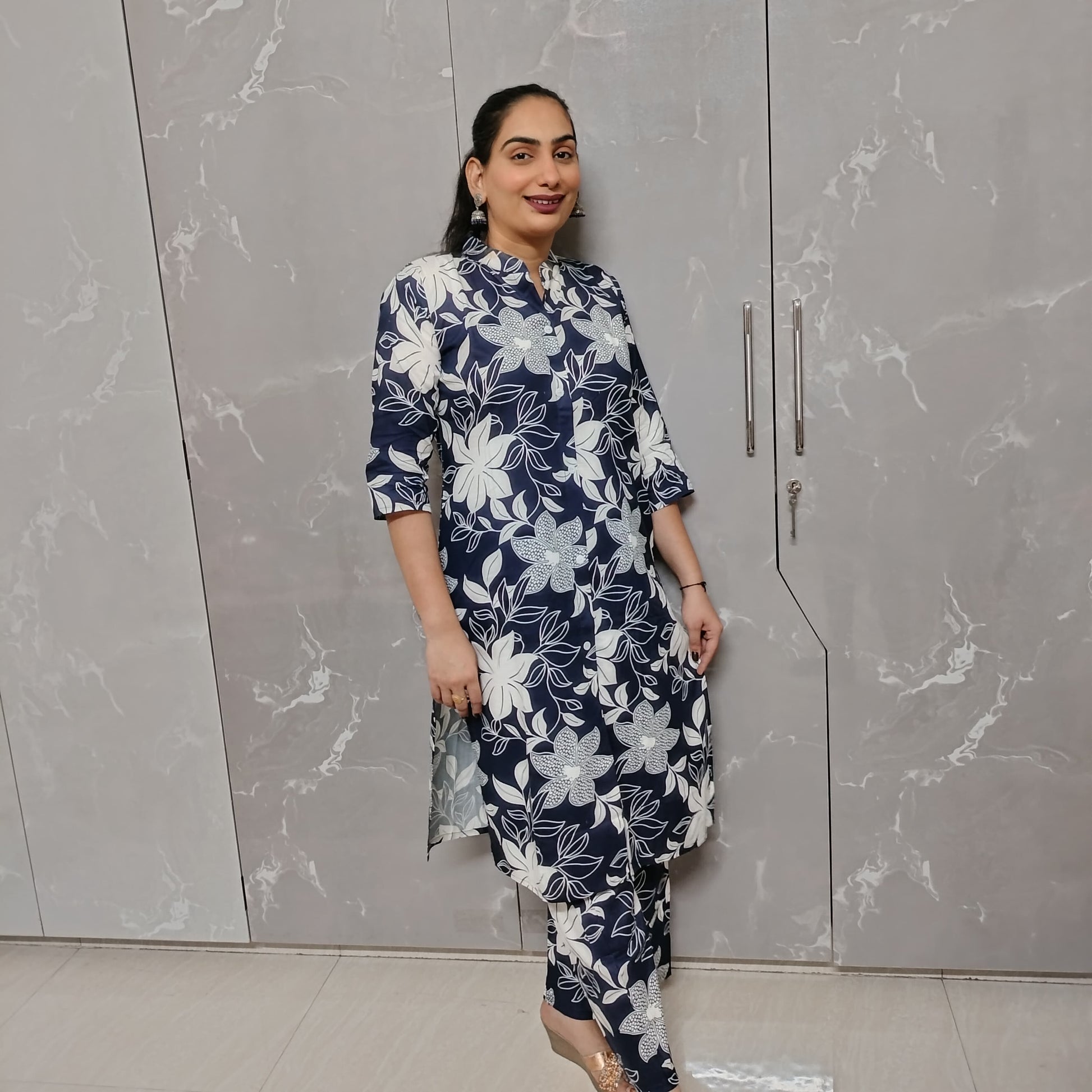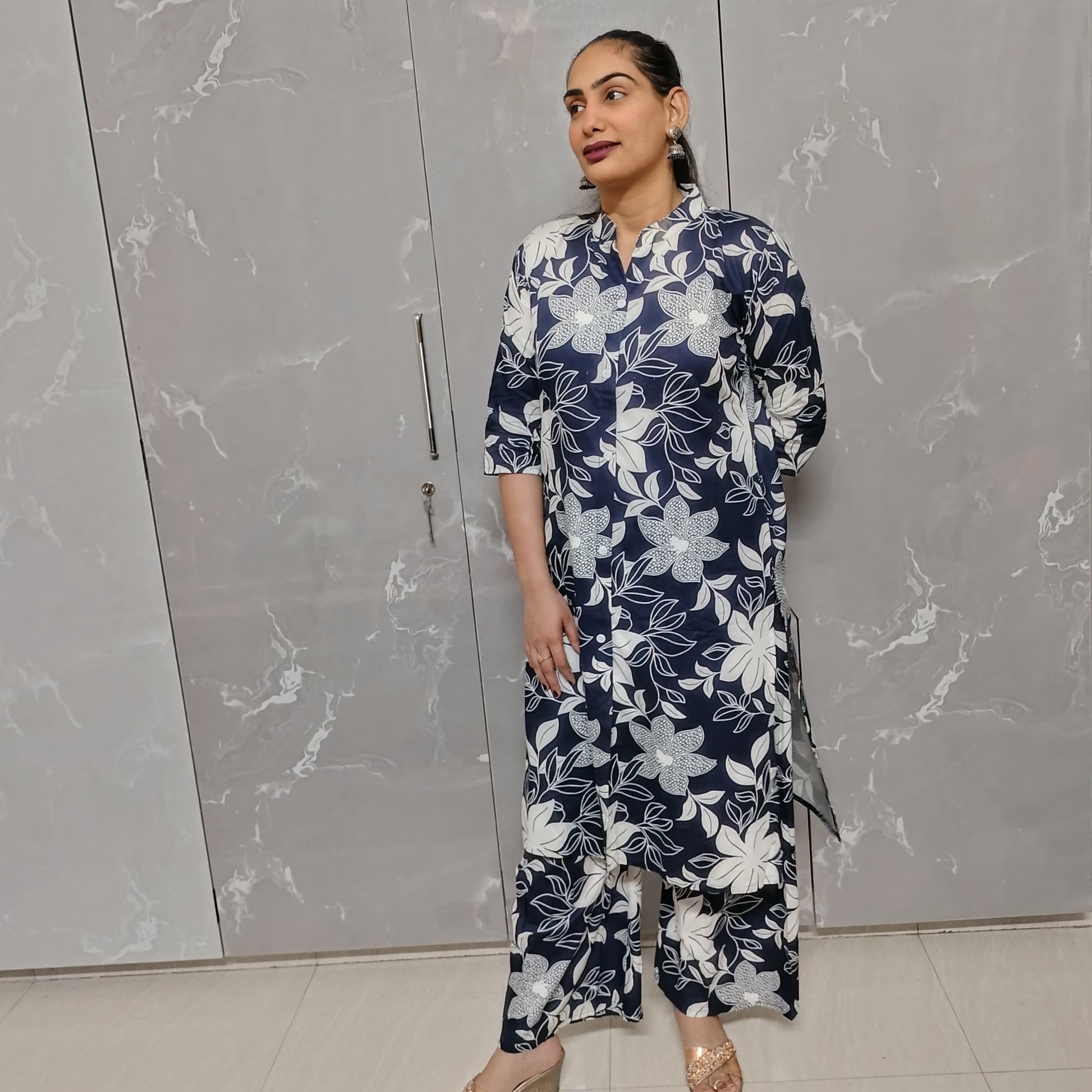 Dark Blue Kurti Plazo Set for Women – 2 Piece Ethnic Wear with White Floral Print (M to XXL)