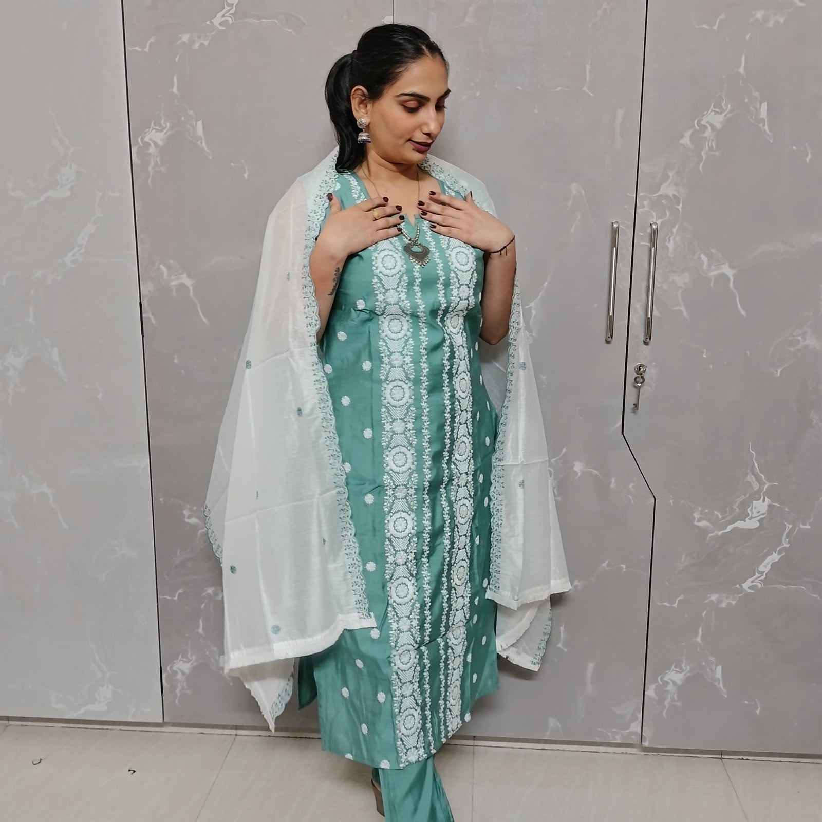 Step into timeless elegance with Neilvastra’s Light Sea Green 3-piece Kurti Set — designed to make every appearance graceful and unforgettable.