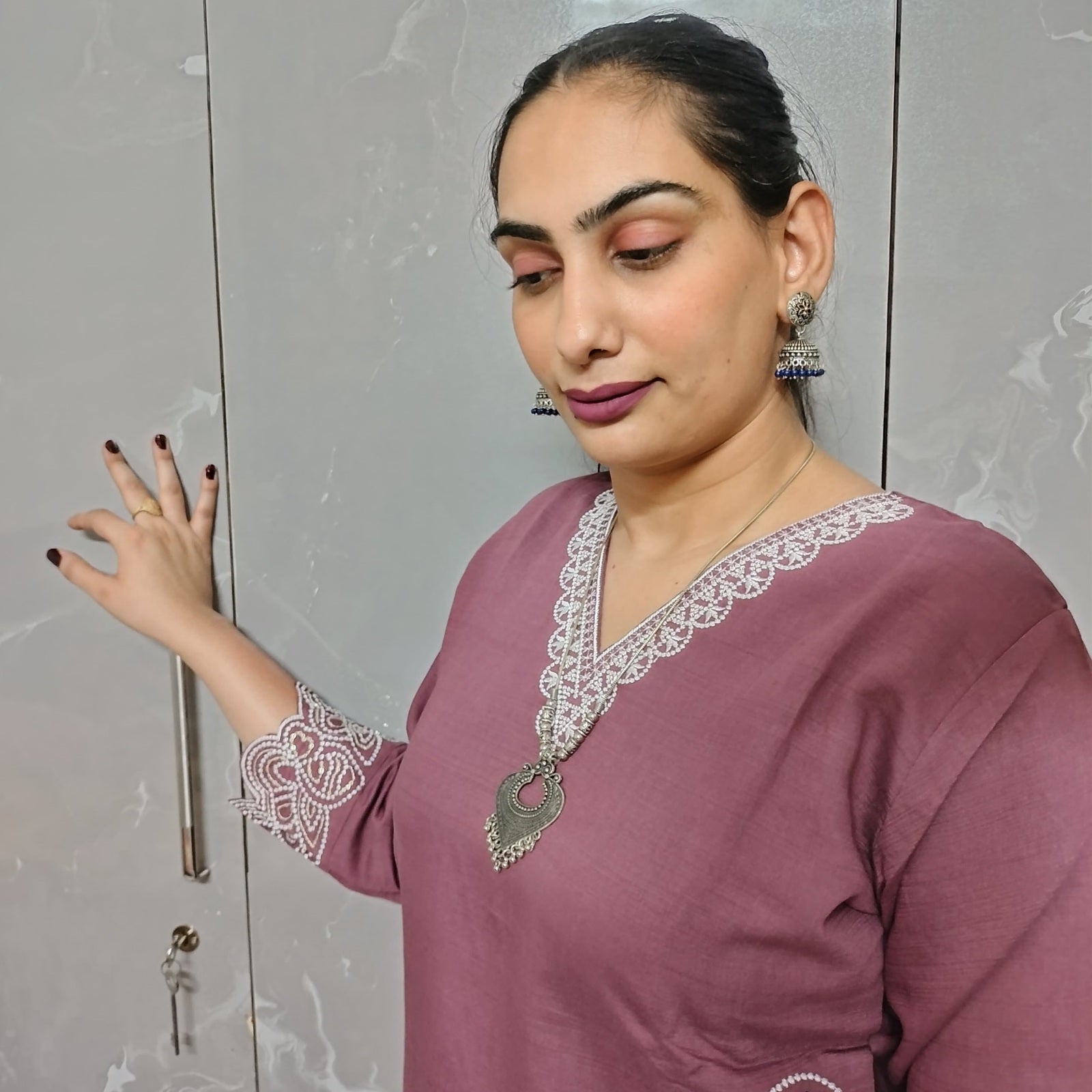Drape yourself in royalty with Neilvastra’s exclusive Wine Cord Set. Crafted from soft cotton and adorned with delicate embroidery work on the neckline and sleeves, this set brings together elegance and comfort.